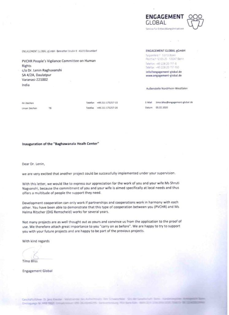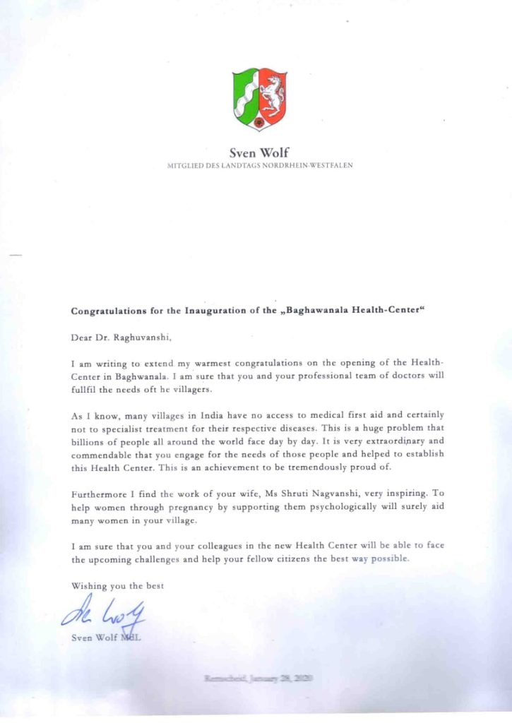 डॉक्टर महेन्द्र कुमार मिश्रा (जनरल फिजिशियन), और महिला रोग विशेषज्ञ डॉक्टर शीतल त्रिपाठी द्वारा 350 मरीजों का स्वास्थ्य परीक्षण किया गया। इसके साथ ही ही स्टीवेन वूल्फ मेम्बर ऑफ़ थे स्टेट असेम्बली, जर्मनी द्वारा इस जांच केंद्र के उद्घाटन और इसके बेहतर संचालन की लिए अपनी शुभ कामनाये भेजी है,साथ ही इंगेजमेंट ग्लोबल के टीमो ब्लेस द्वारा भी इस जांच केंद्र के उद्घाटन और कुशल संचालन के लिए अपनी शुभकामनाएं भेजी है।