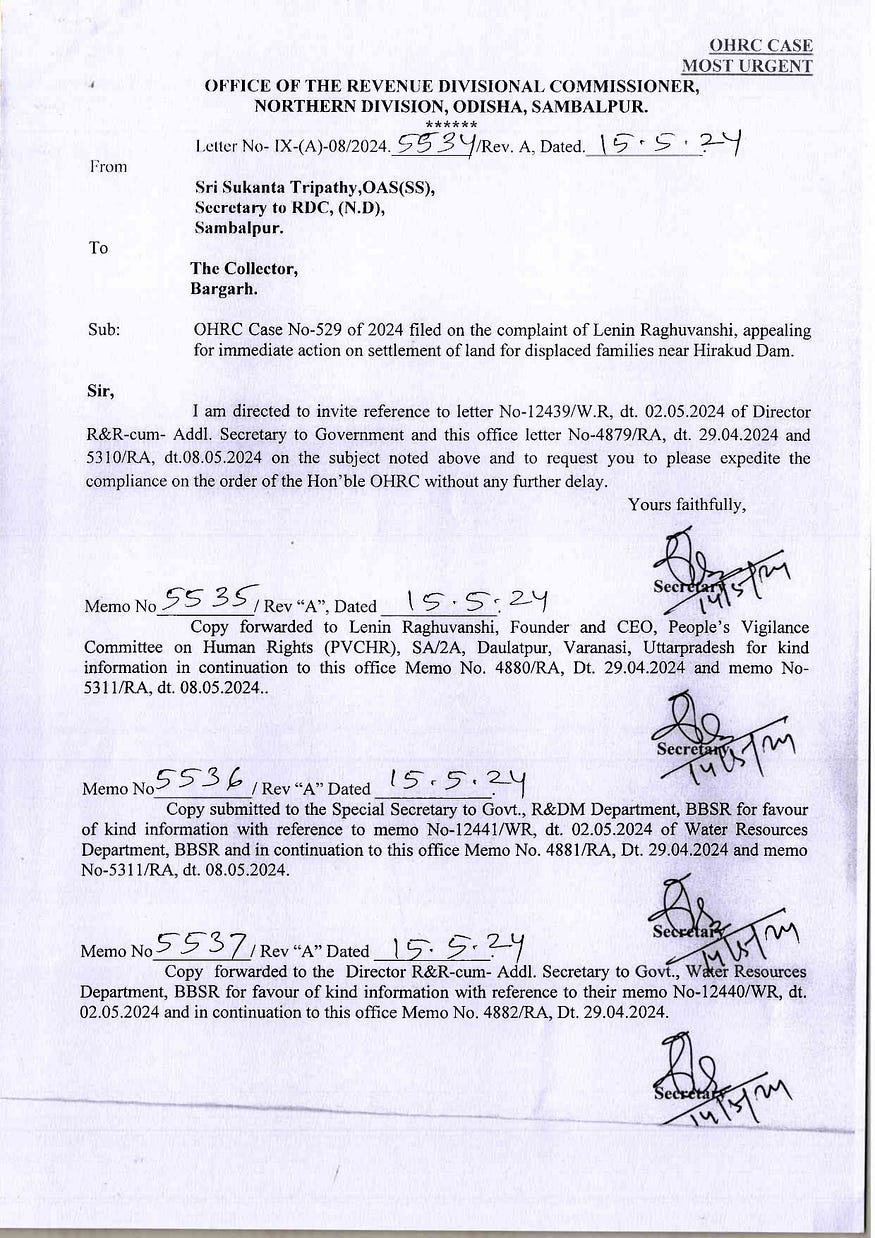 The Hon’ble Odisha Human Rights Commission (OHRC) had previously issued an order directing the settlement of land for the displaced families. However, compliance with this order has been delayed, exacerbating the plight of the villagers. According to a recent letter from the Office of the Revenue Divisional Commissioner, Northern Division, Odisha, Sambalpur (Letter No- IX-(A) -0812024. ,531/Rev. A, Dated 19.05.2024), there has been a directive to expedite compliance with the OHRC’s order without further delay.